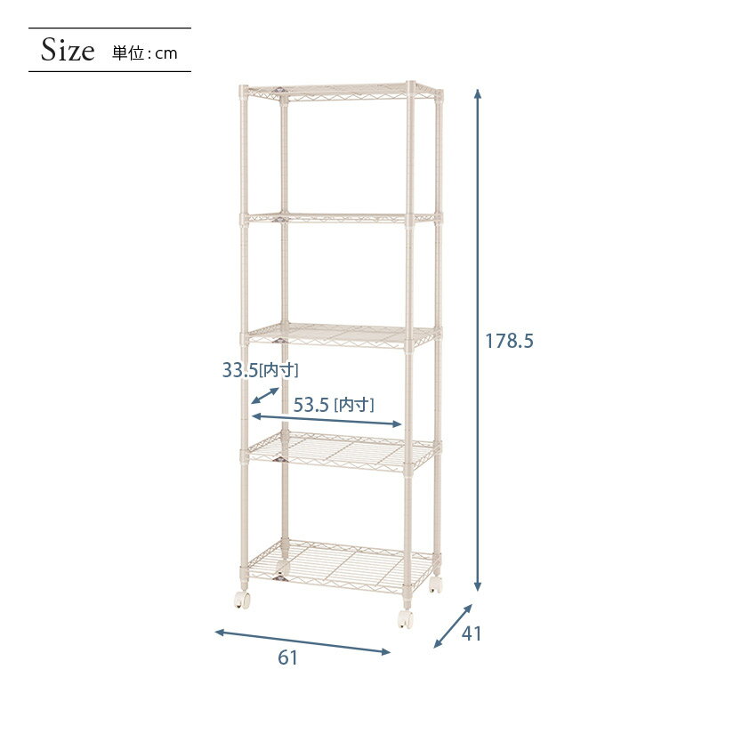 商品仕様 商品シリーズ ルミナス リシェ フリーラック 5段 幅60 外形寸法 幅61×奥行41×高さ178.5cm※高さはナイロンキャスター装着時のものです。