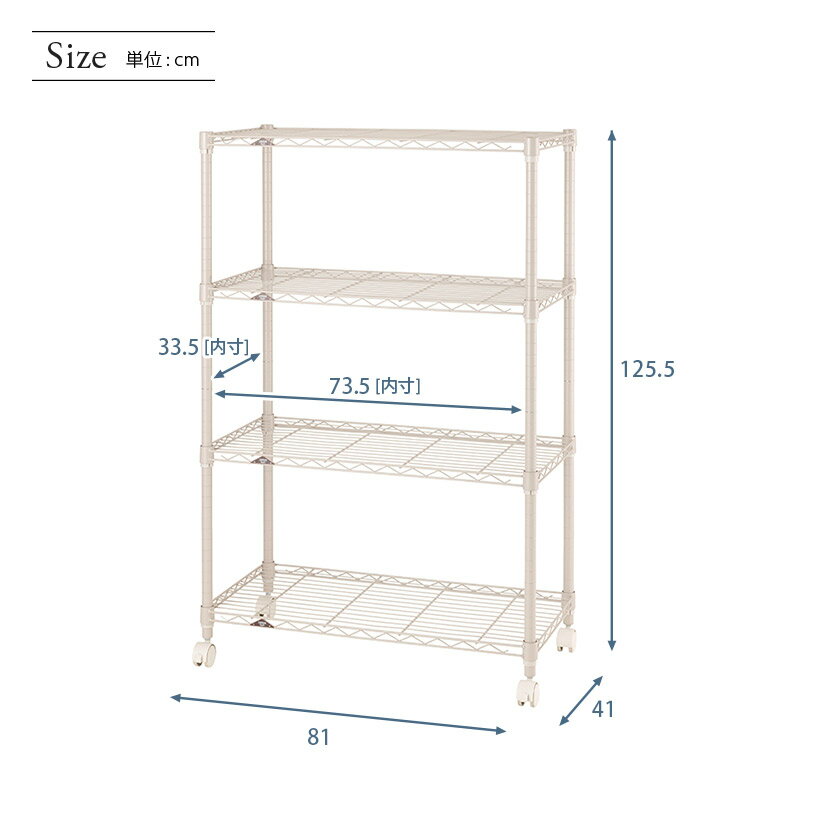 商品仕様 商品シリーズ ルミナス リシェ フリーラック 4段 幅80 外形寸法 幅80×奥行41×高さ125.5cm※高さはナイロンキャスター装着時のものです。